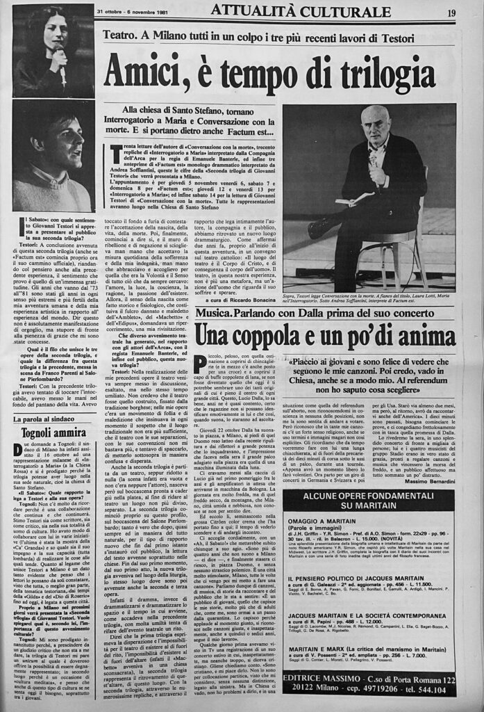 Giovanni Testori -Malgrado tutto, è ancora la città in cui si rispecchia con più forza, dolcezza e drammaticità la situazione del paese. G. T. – Ce ne sono state tante. Questa che viviamo, nei fermenti nuovi, soprattutto nella ripesa ardente, luminosa e totale della coscienza cristiana, è una della più straordinarie: anche perché vede […]