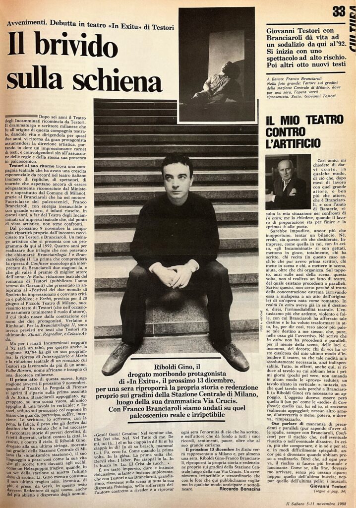 Cari amici mi chiedete di darvi conto, in qualche modo, di ciò che, dopo mesi di lavoro con quel grande attore, o ben più che attore, che è Branciaroli, e con l’aiuto di Banterle, risulta la mia situazione nei confronti di In exitu; me lo chiedete, quando il lavoro di preparazione sta per finire e