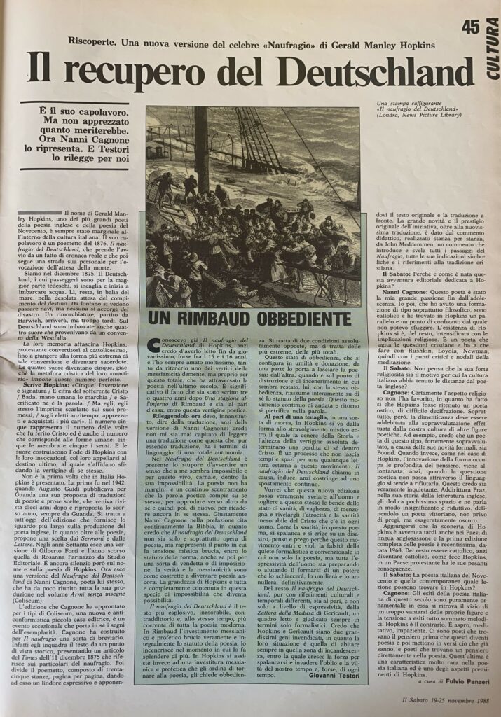Conoscevo già Il naufragio del Deutschland di Hopkins, anzi credo d’averlo letto fin da giovanissimo, forse fra i 15 e i 16 anni, e l’ho sempre amato moltissimo, tanto da ritenerlo uno dei vertici della messianicità demente, ma proprio per questo totale, che ha attraversato la poesia nell’ultimo secolo. È significativo il fatto che sia