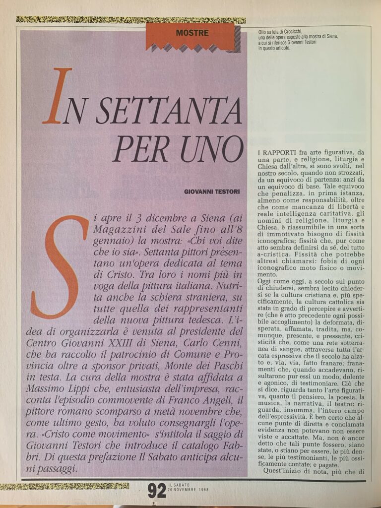 Si apre il 3 dicembre a Siena (ai magazzini del sale fino all’8 gennaio) la mostra: «chi voi dite che io sia». Settanta pittori presentano un’opera dedicata al tema di Cristo. Tra loro i nomi più in voga della pittura italiana. Nutrita anche la schiera straniera, su tutte quella dei rappresentanti della nuova pittura tedesca.