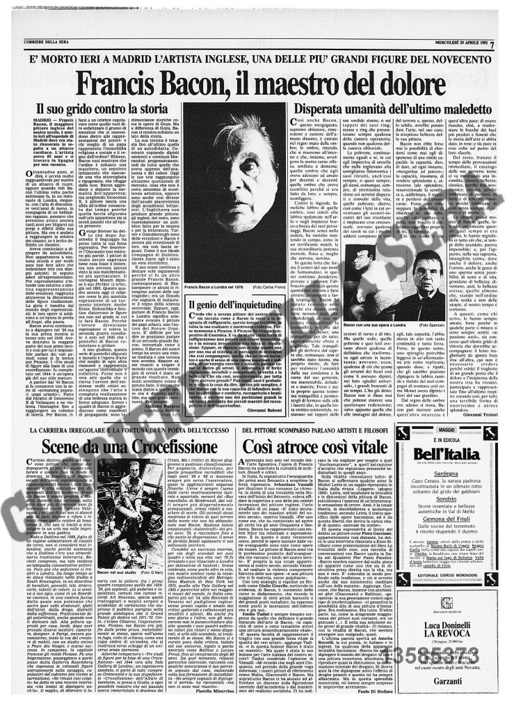 Così anche Bacon, questo svergognato, supremo abitatore, rimestatore e cantore dell’umano disastro, è entrato nel regno muto delle ombre; le ombre, intendo, che si muovono all’interno e che, insieme avvolgono la nostra carne offesa, umiliata e demente; quelle ombre che egli aveva adescato e amato per decenni e decenni; quelle ombre che aveva sconfitto, perché