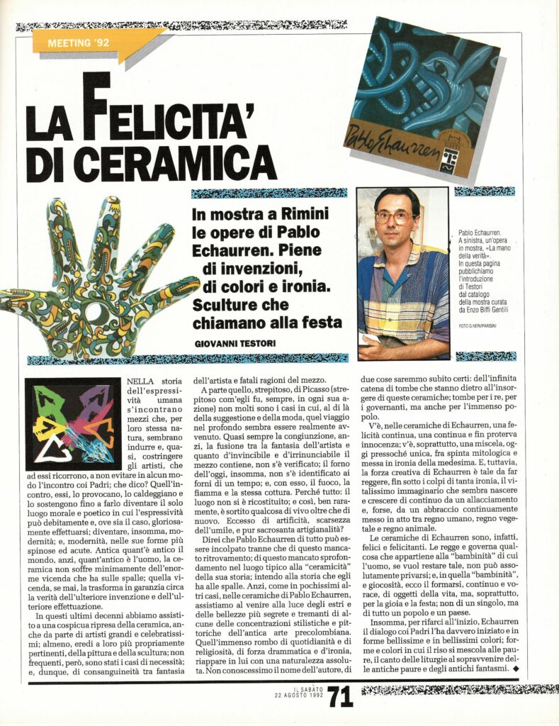 L’arcata che Mitoraj va stendendo sull’arte contemporanea, un’arcata che sembra assorbire e superare tutte le impervietà e, insieme, le facilità , sta dando solo in questi tempi la misura di dolente partecipazione al destino dell’uomo che, prima, una lettura troppo edonistica poteva, se non nascondere, certo limitare. Pel vero il senso d’una bellezza suprema, il bisogno