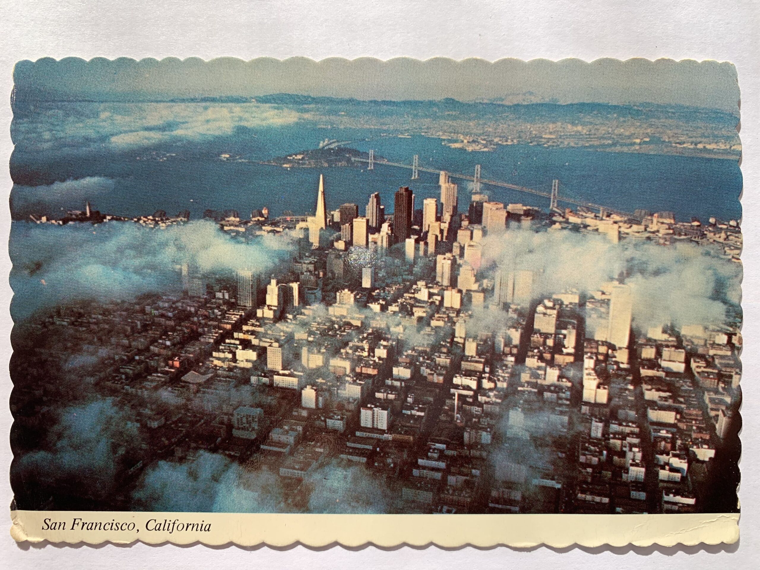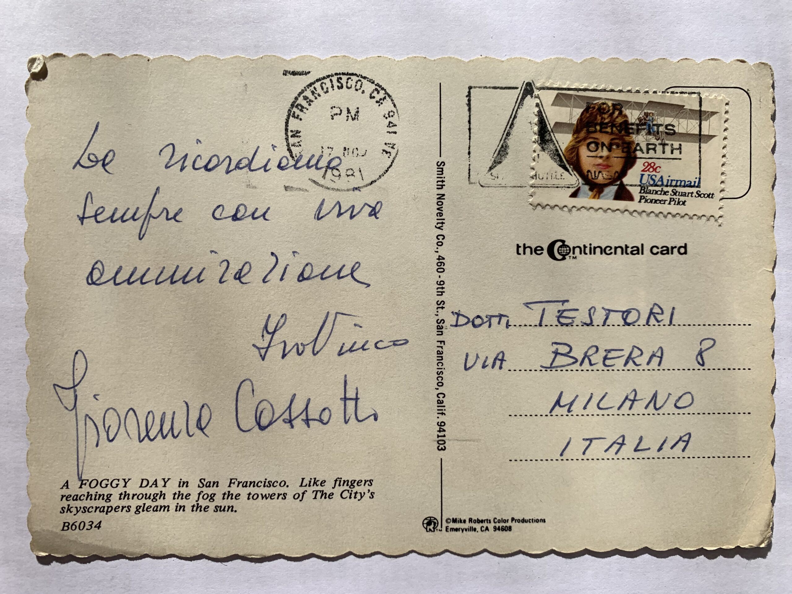 Cartolina di saluti rappresentante sul verso “A FOGGY DAY in San Francisco.” Il francobollo riporta l’immagine di Blanche Stuart Scott, Pioneer Pilot. Indirizzata al Dott. Testori, indirizzo: Via Brera 8, Milano