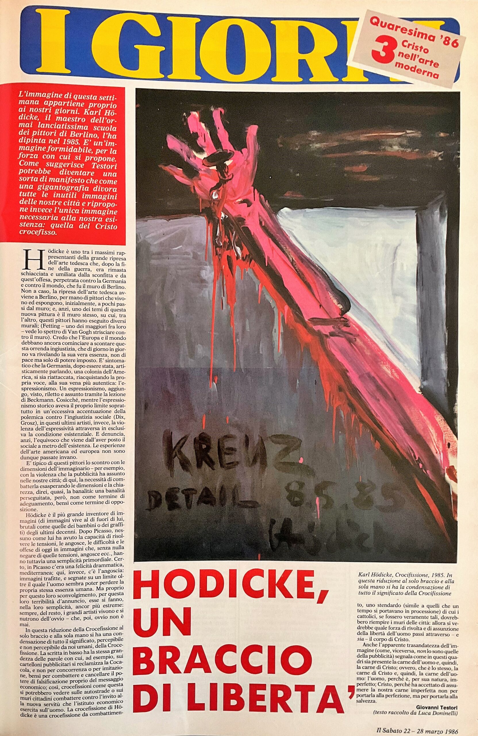 Terzo articolo del ciclo Quaresima '86. Cristo nell'arte moderna (1986.P11). In questo intervento si commenta un'opera di Karl Hödicke, Crocifissione, del 1985 (collezione privata).
