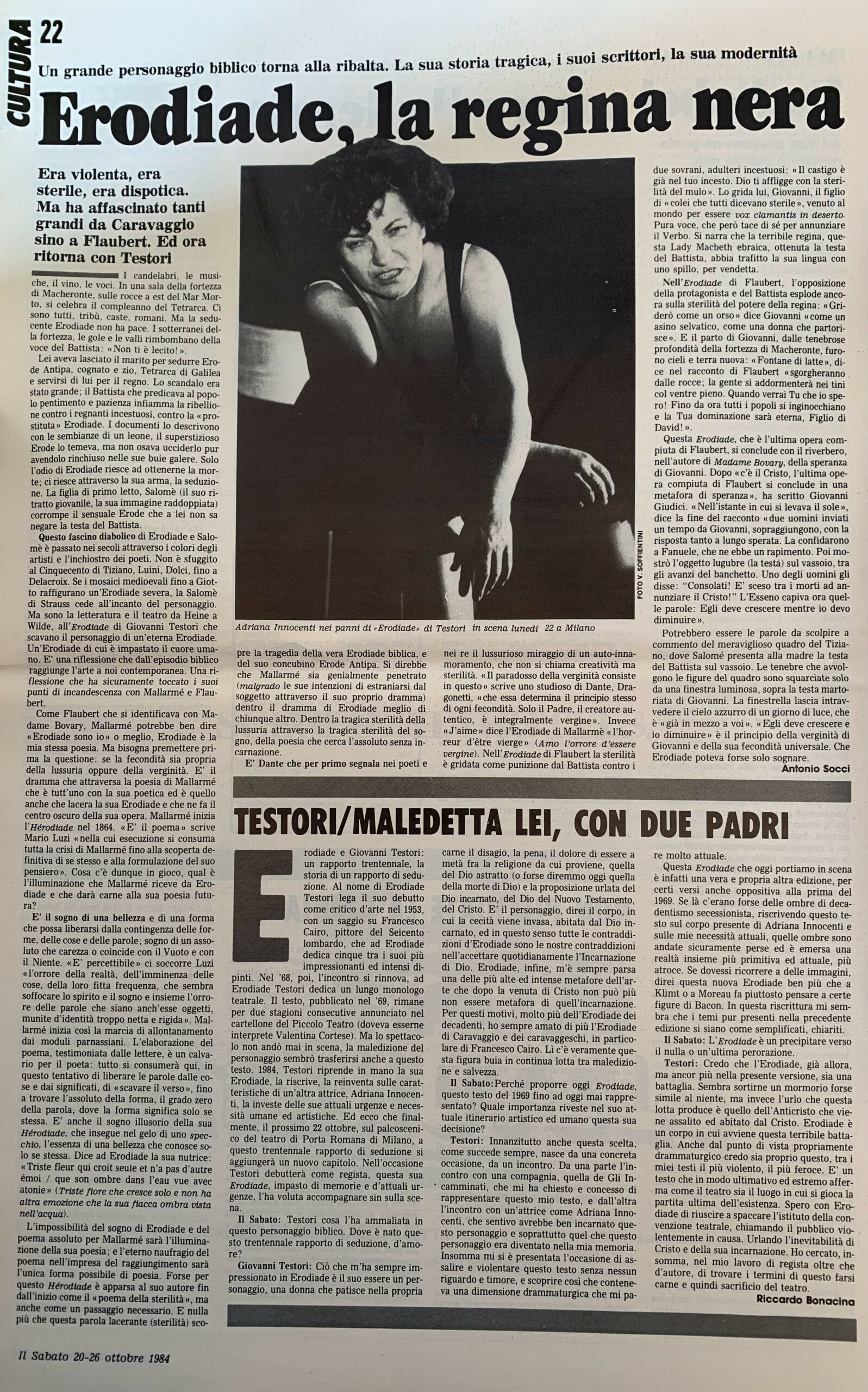 Rilasciata in occasione della messa in scena della seconda versione dell' Erodiade, che debuttò al Teatro di Porta Romana di Milano il 22 ottobre 1984. Delle cinque domande che compongono l'intervista ne vengono pubblicate tre, le altre due verranno edite sul Programma di sala dello spettacolo (Adriana Innocenti?, 1984), dove non viene però riproposta la prima di quelle qui presentate.