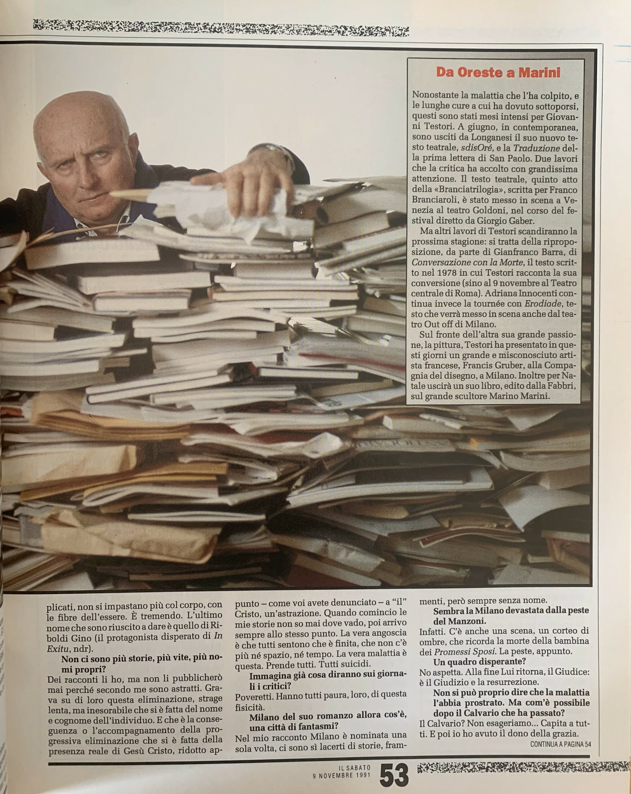 Nell'intervista Testori parla del suo ultimo romanzo, della cultura e della città di Milano, del pensiero antico, dell'arte di Caravaggio e del suo rapporto con Roberto Longhi, il suo maestro.