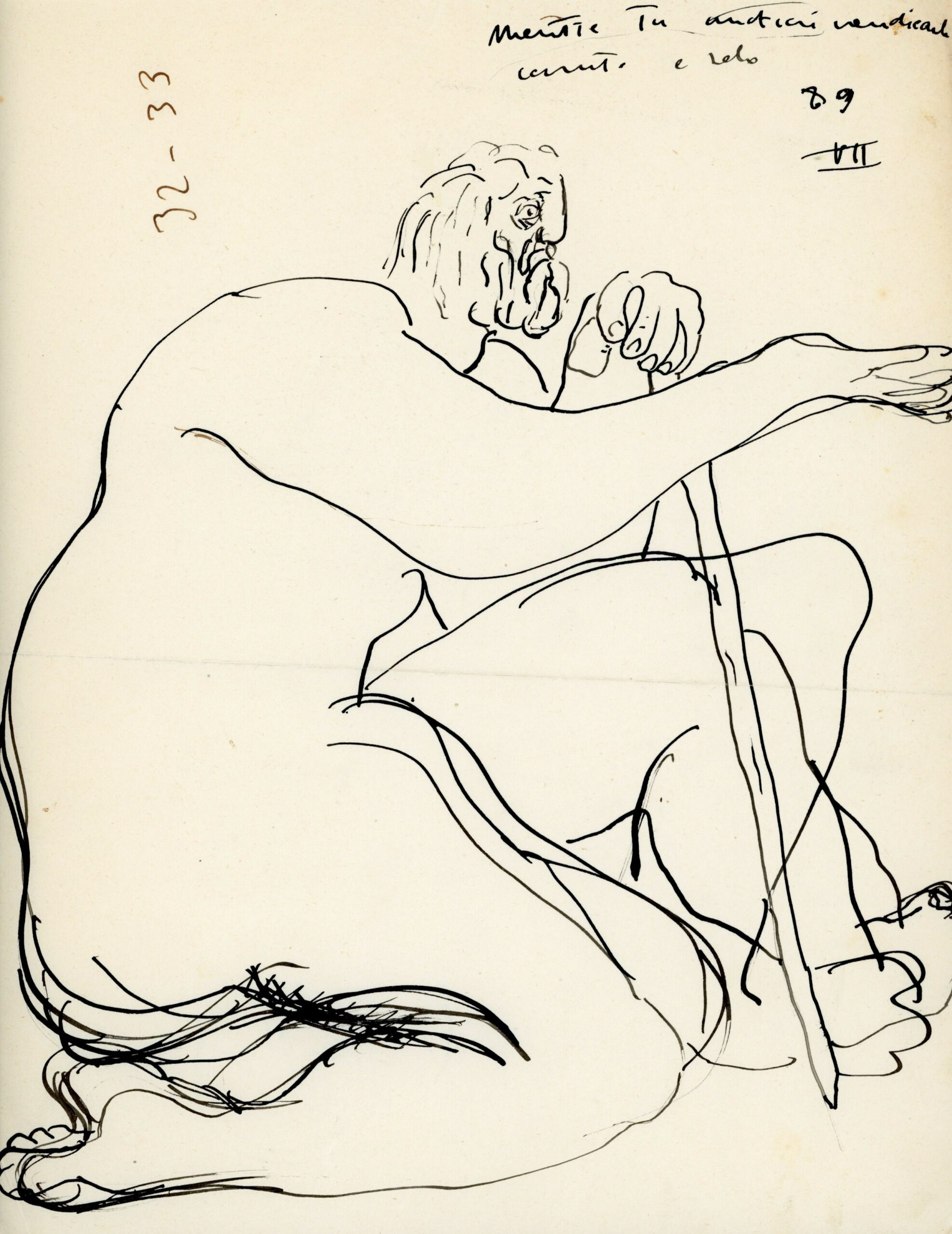 Sul fronte in alto a sinistra a inchiostro marrone è indicato "32-33" e a inchiostro nero "mentre su andrai mendicando / canuto e solo / 89 / VII". Il disegno, quindi, sembrerebbe associato ai vv. 88-89 dell'ode di Giuseppe Parini numero VII dal titolo "La evirazione (La Musica)".