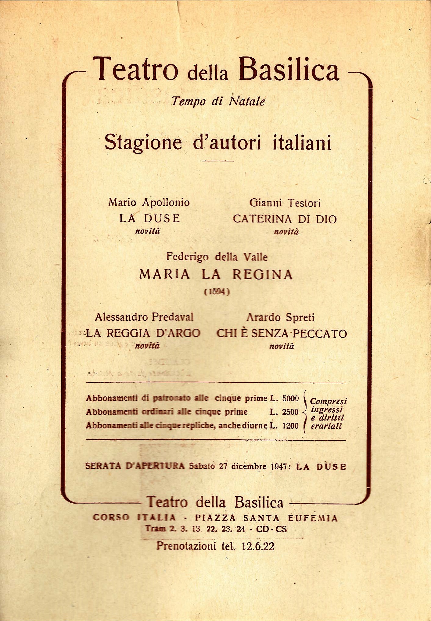 Presentazione del testo teatrale La Caterina di Dio (1947.P11) in occasione della messa in scena del 10 gennaio 1948 con la regia di Enrico d'Alessandro e Franca Norsa (poi in arte Franca Valeri) nei panni della protagonista. Nel programma di sala vengono presentati i cinque spettacoli della stagione in programma al Teatro della Basilica. La serata di apertura indicata è quella del 27 dicembre.