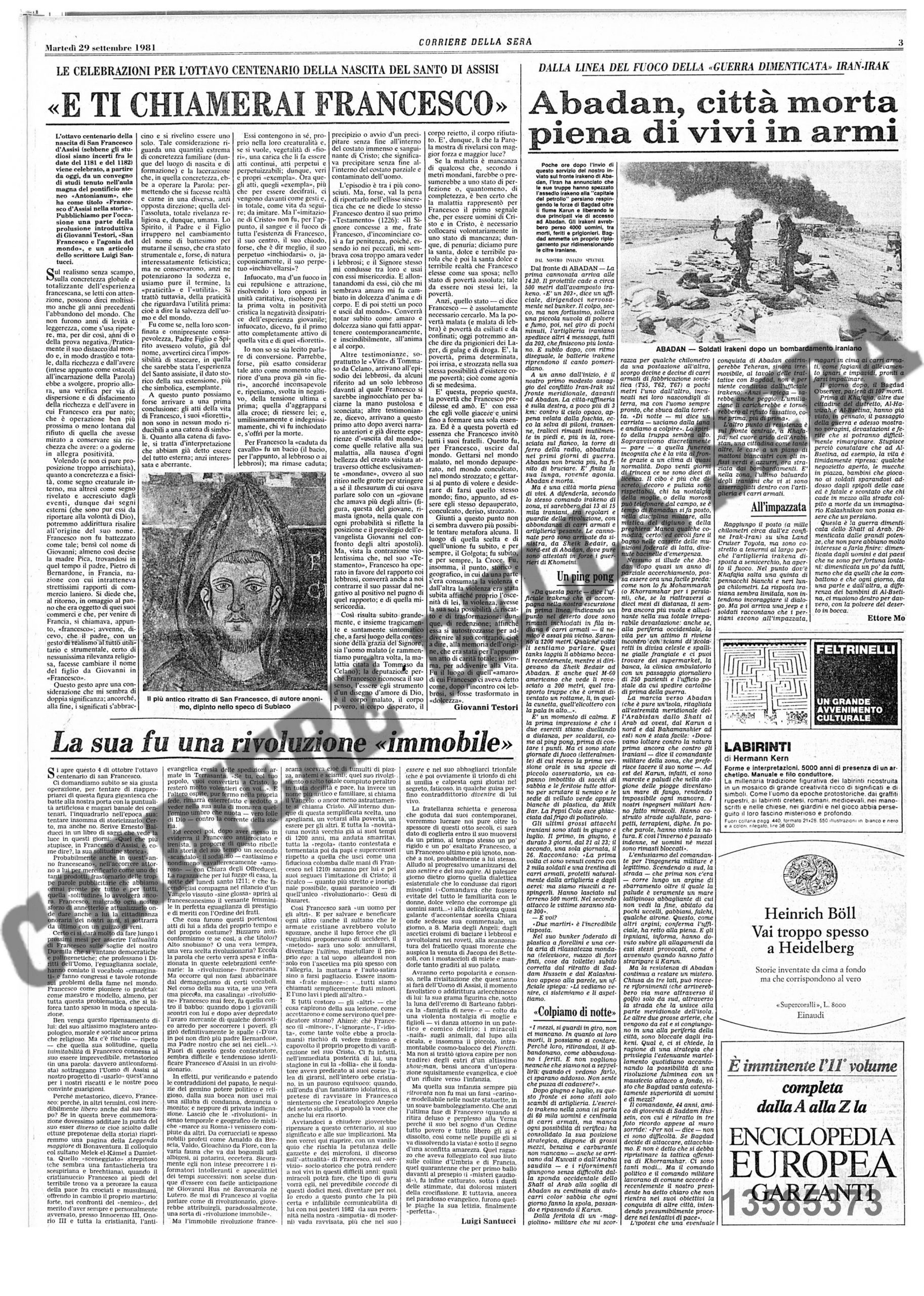 Anteprima della prolusione intitolata San Francesco e l'agonia del mondo, letta al convegno Francesco d'Assisi nella storia. Primo convegno di studi per l'VIII centenario della nascita di S. Francesco (1182-1982) (Roma, aula magna del Pontificio ateneo Antonianum, 29 settembre - 2 ottobre 1981). L'occhiello comprende anche un articolo di Luigi Santucci. L'intervento non venne pubblicato negli atti del convegno curati da Servus Gieben (Roma, Istituto Storico dei Cappuccini, 1983). Altri stralci della prolusione vennero pubblicati su «L'Osservatore Romano» (1981.P77). Il testo integrale apparve su «Il Sabato» (1981.P88).