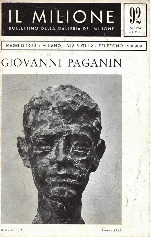 Bollettino interamente dedicato allo scultore in occasione della sua personale (Milano, Galleria del Milione, 3-20 maggio 1963). Il saggio di Testori, che occupa l'intero bollettino, viene ripubblicato in «Settimo Giorno» (1963.P8) in una versione rimaneggiata e, l'anno seguente, ulteriormente riadattato nel volume Giovanni Paganin. Sculture dal 1959 al '63 (1964.V2).