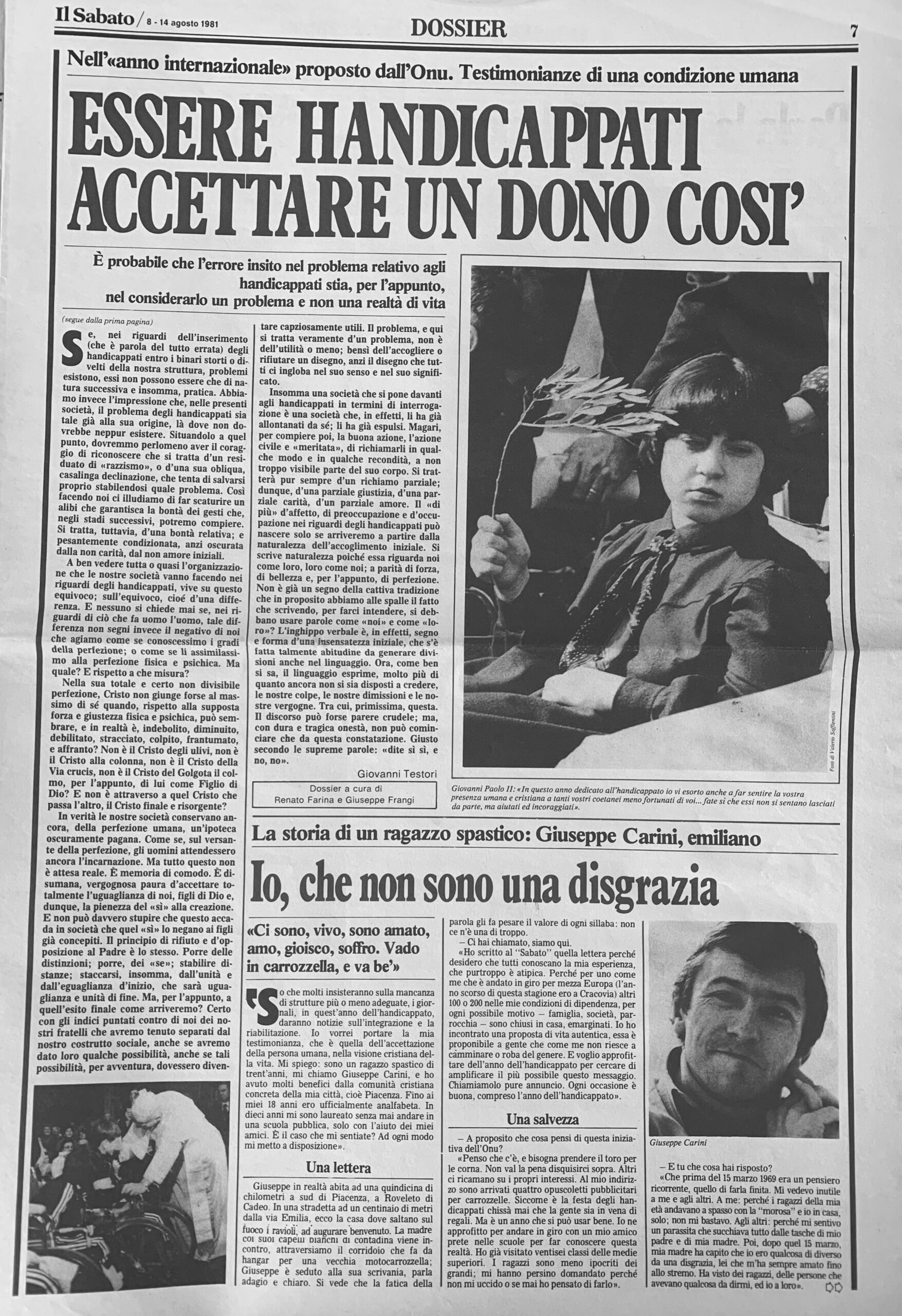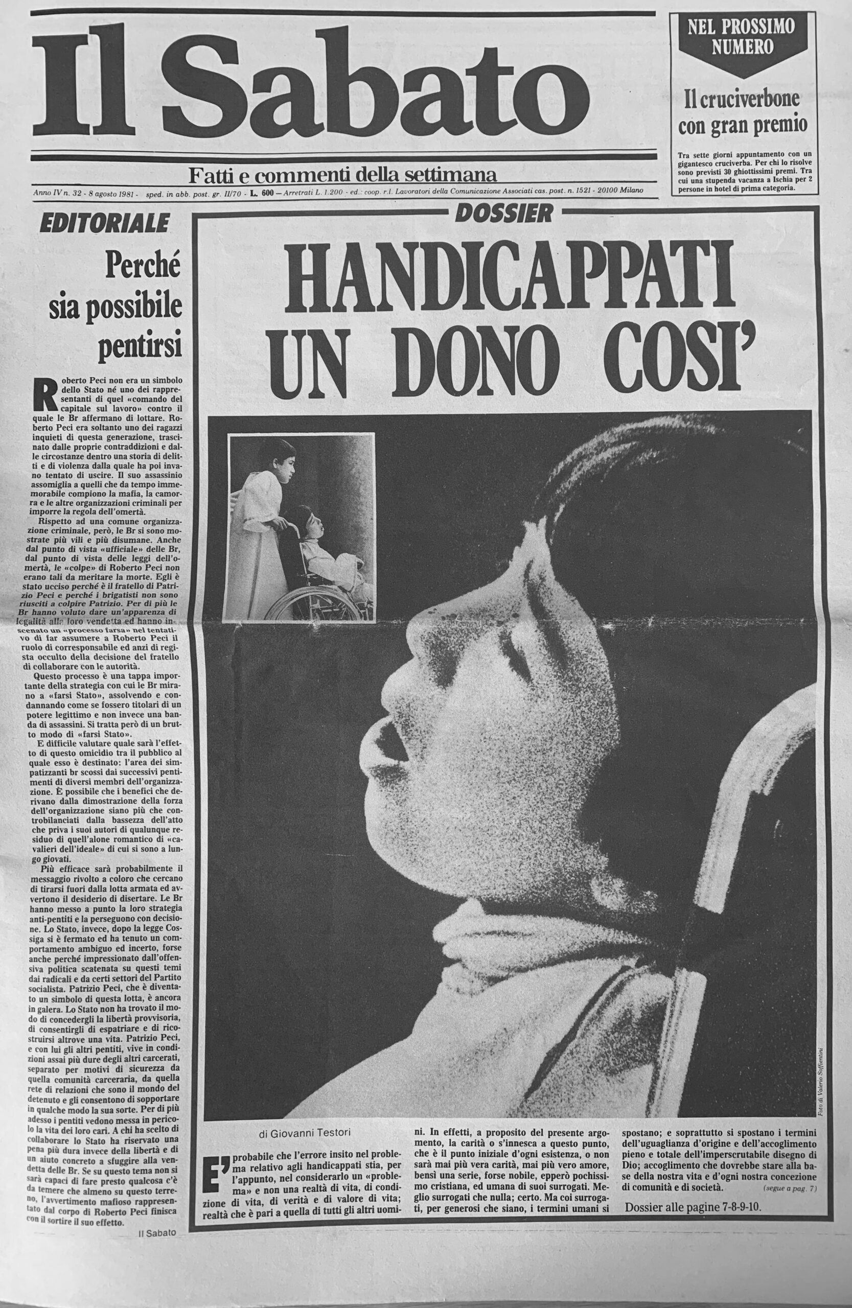 Articolo d'apertura di un dossier sull'anno internazionale dei portatori di handicap, curato da Riccardo Bonacina e Giuseppe Frangi. Il titolo provocò la reazione di un lettore al quale Testori rispose (1982.P1). Incluso in La Maestà della vita (1982.V6).