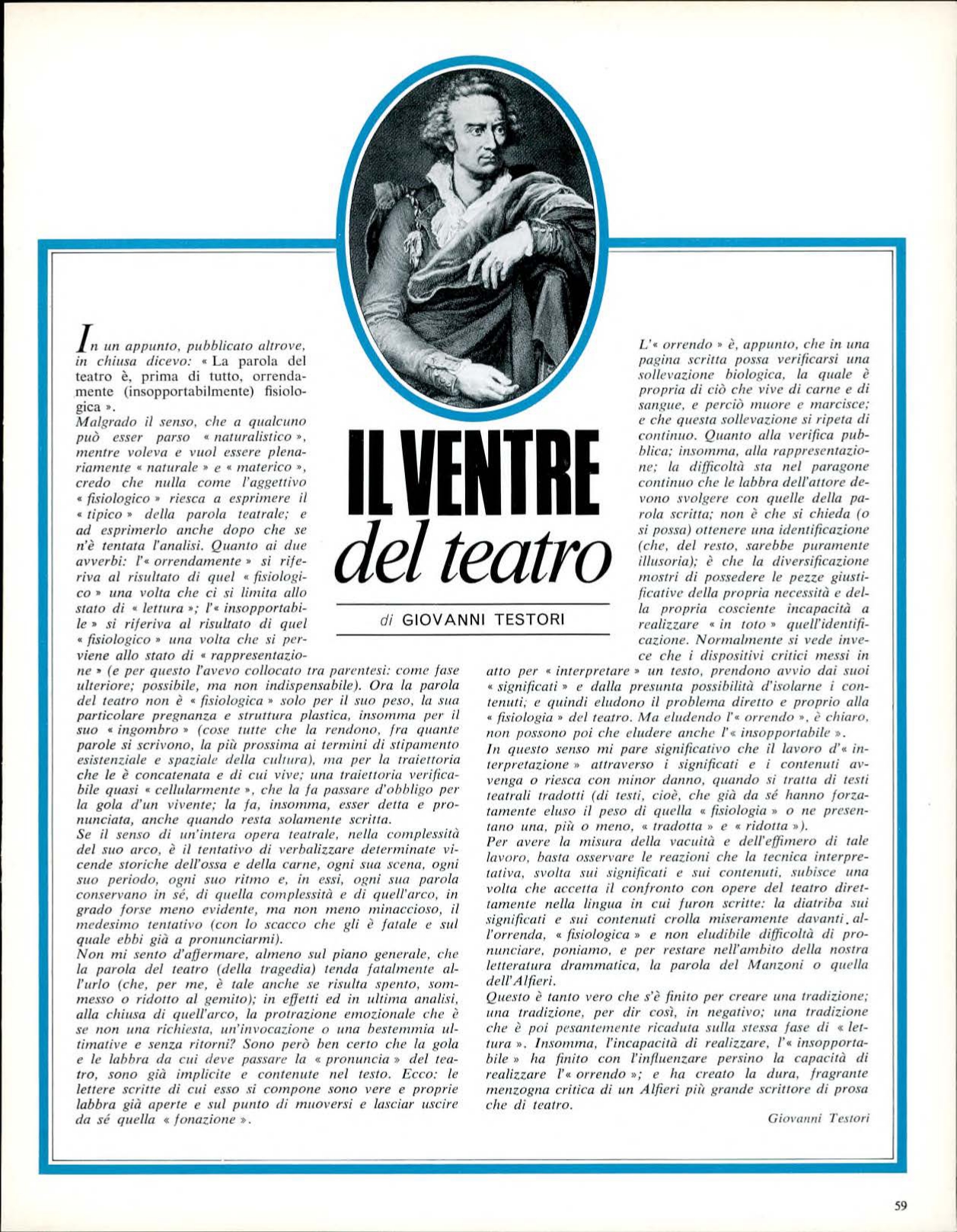 Post scriptum al saggio pubblicato su «Paragone» (1968.P3), del quale sente il bisogno di spiegare meglio una delle affermazioni: "La parola del teatro è, prima di tutto, orrendamente (insopportabilmente) fisiologica" (p. 96). Con una considerazione finale sul teatro alfieriano.