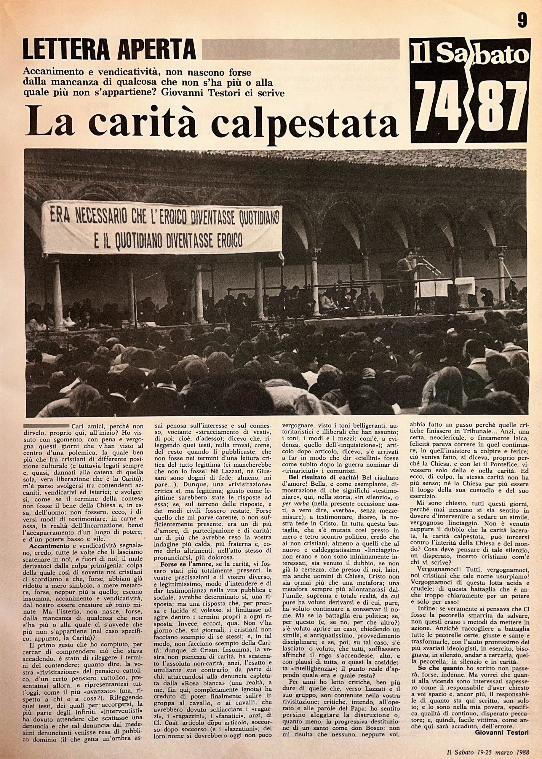 Lettera aperta in difesa del «Sabato», oggetto di un processo ecclesiastico, in seguito alla pubblicazione a puntate di una ricostruzione storica, critica nei confronti di Giuseppe Lazzati, già rettore dell'Università Cattolica di Milano.