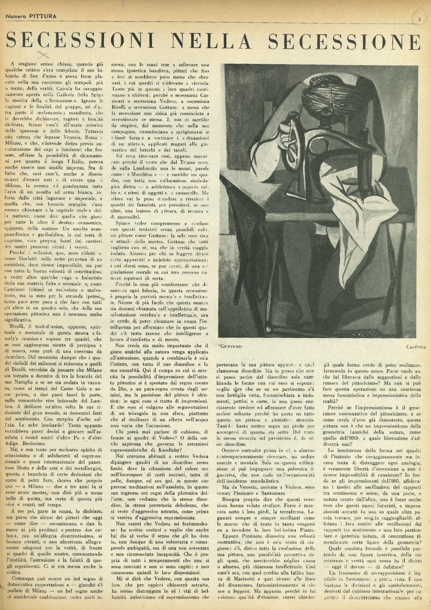 Recensione della Prima mostra del Fronte Nuovo delle Arti (Milano, Galleria della Spiga, 12 giugno - 12 luglio 1947). Il titolo dell’articolo allude all’origine del gruppo Fronte Nuovo delle Arti, nato dalla Nuova Secessione Artistica Italiana.