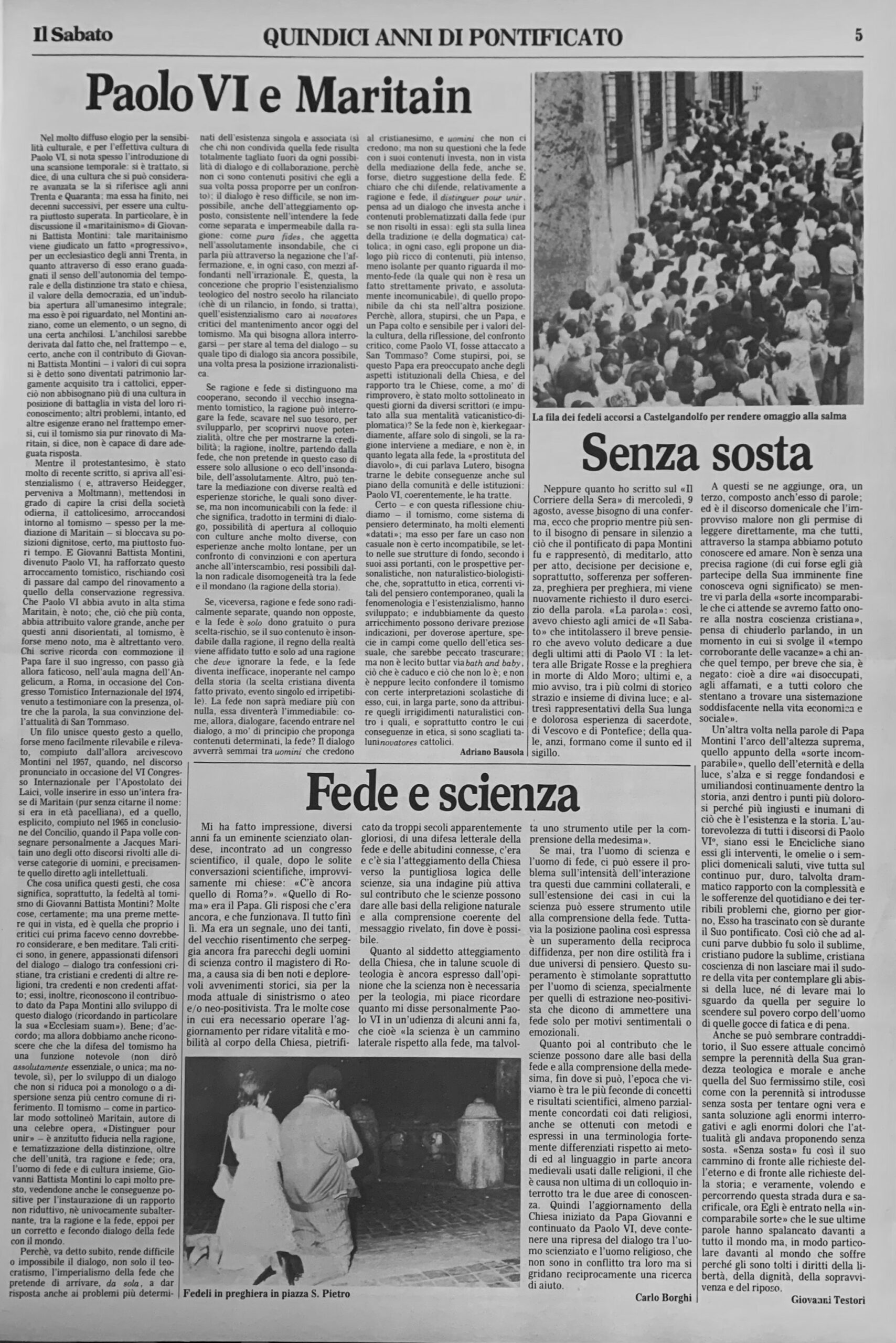 Intervento sulla scomparsa di papa Paolo VI. Il titolo della pagina, Quindici anni di pontificato, comprende anche un articolo di Adriano Bausola e Carlo Borghi.