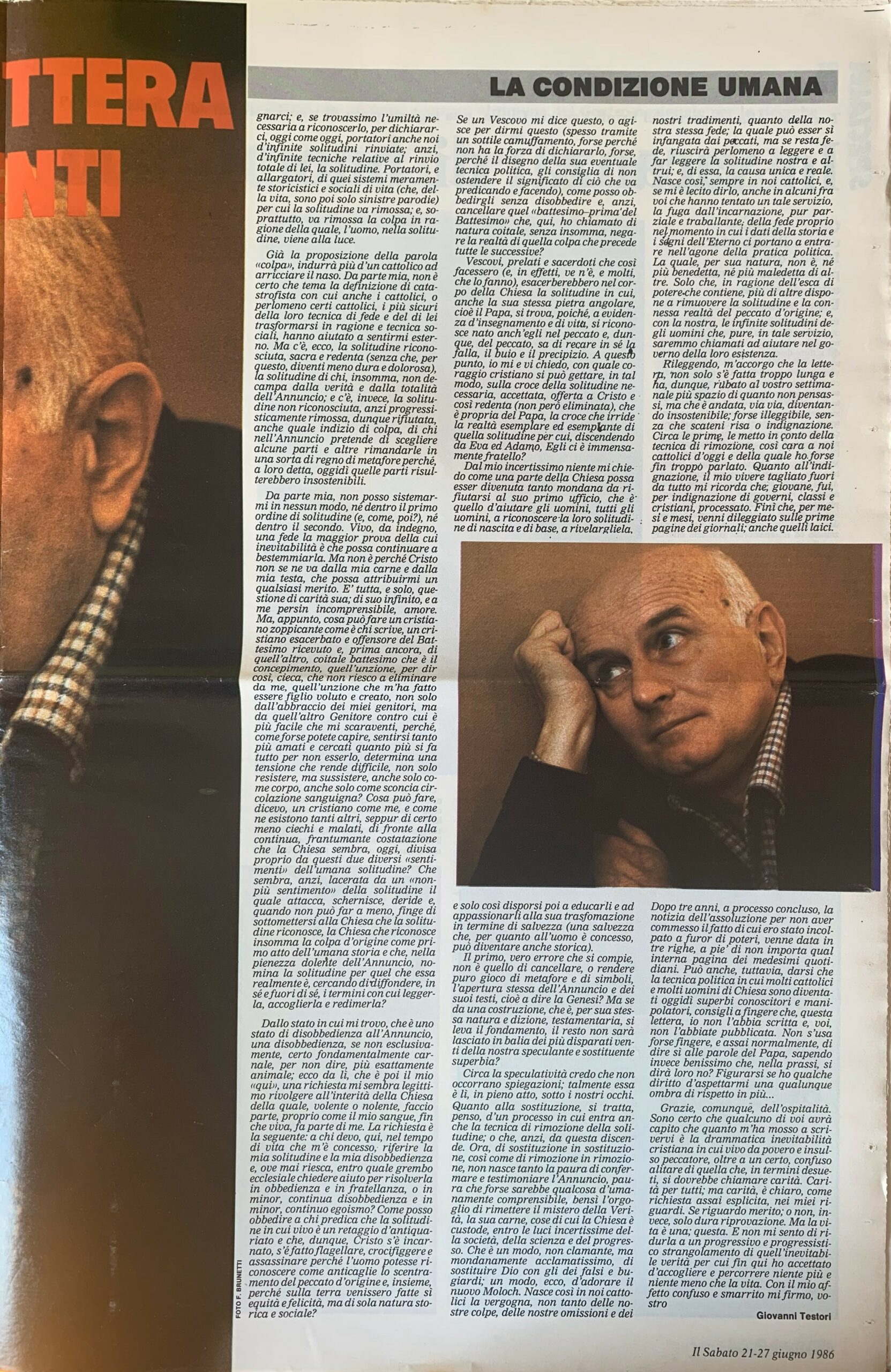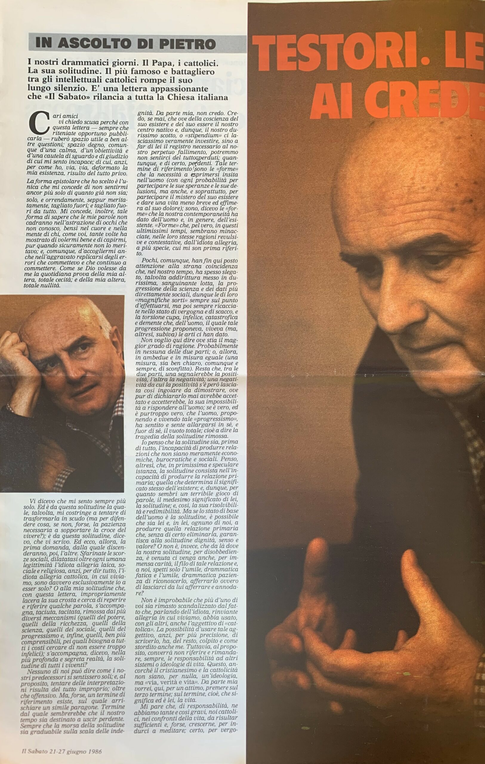 Lettera aperta agli amici de «Il Sabato». Testori spiega di scegliere la forma epistolare perché la più adatta a descrivere il suo momento di profonda solitudine. La lettera è pubblicata nel dossier In ascolto di Pietro, che raccoglie interventi sull'enciclica di Giovanni Paolo II, Dominum et vivificantem.